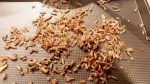 8. I decided to roast almond slivers in the oven with honey and added them to the top of the cake for decoration. To do this, add parchment paper to a baking tray. Then spread a bag of almond slivers onto the parchment paper and drizzle honey over the almond pieces. Then add salt. Place in oven for about 4 minutes. Wait for them to cool and then sprinkle on top of icing.